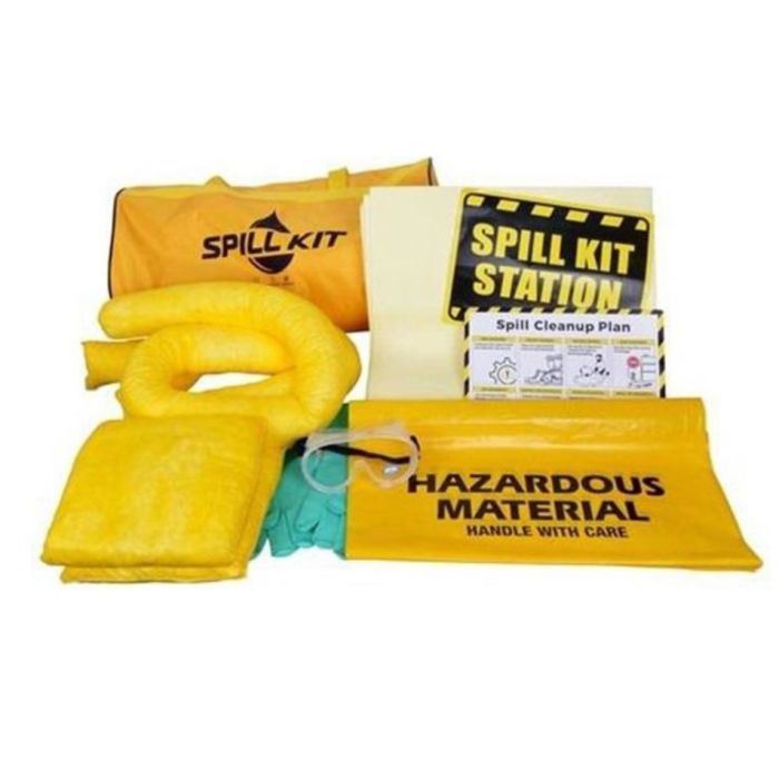 25 Pcs- Chemical absorbent pads (melt-blown) 2 Pcs – Chemical absorbent socks, medium size. 2 Pcs – Chemical absorbent pillows, medium size 2 Pcs – Hazmat waste disposal bag and tie. 1 Pc - Safety Goggles, Splash Proof 1 Pair – Nitrile Safety gloves 1 Pc – Spill control instruction guide 1 Pc - Spill Station Warning Sign 1 Pc – Yellow carry bag for spill kit contents