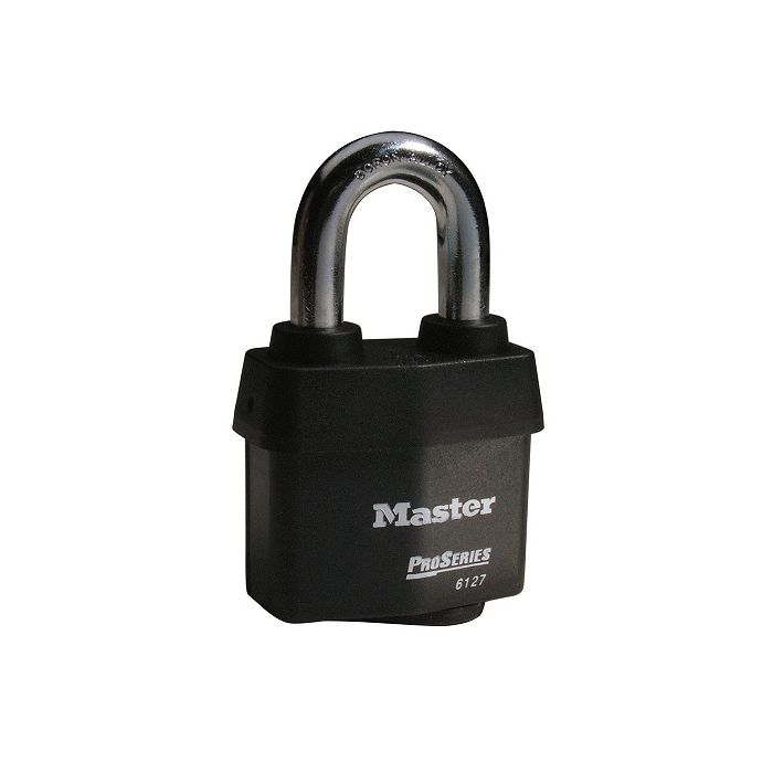 The Master Lock No. 6127 ProSeries Weather Tough Covered Laminated Padlock features a 2-5/8in (67mm) wide heavy steel body to withstand physical attack and a 1-3/8in (35mm) tall, 7/16in (11mm) diameter hardened boron alloy shackle for superior cut resistance.