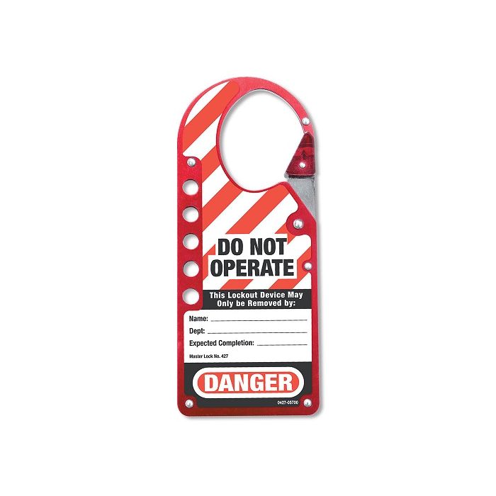 The Master Lock No. 427 Labeled Red Safety Lockout Hasp features a 1-3/4in x 2-1/8in (45mm x 54mm) diameter inside jaw clearance and is designed to fit more lockout points than alternative rivet-hinge labeled lockout hasps.