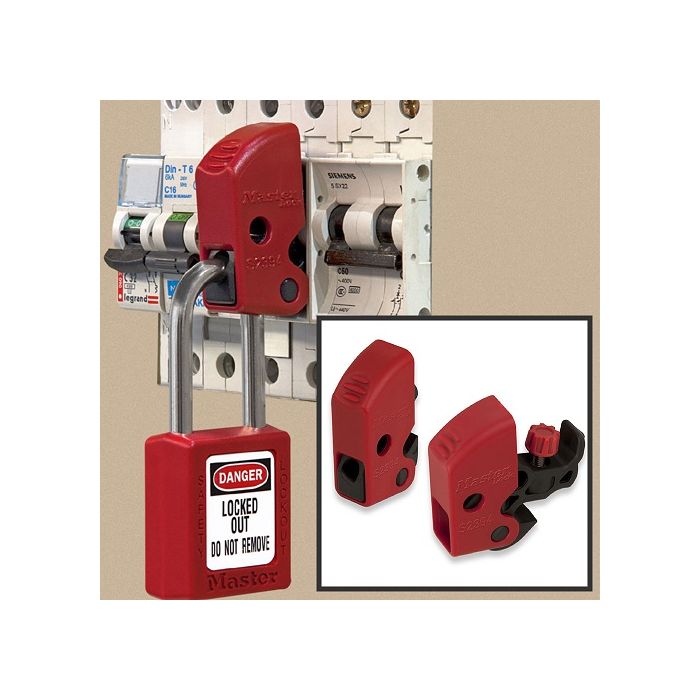 The Master Lock No. S2394 Universal Miniature Circuit Breaker Lockout Device locks virtually all miniature ISO/DIN pin-out circuit breakers throughout the world.